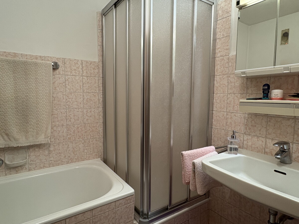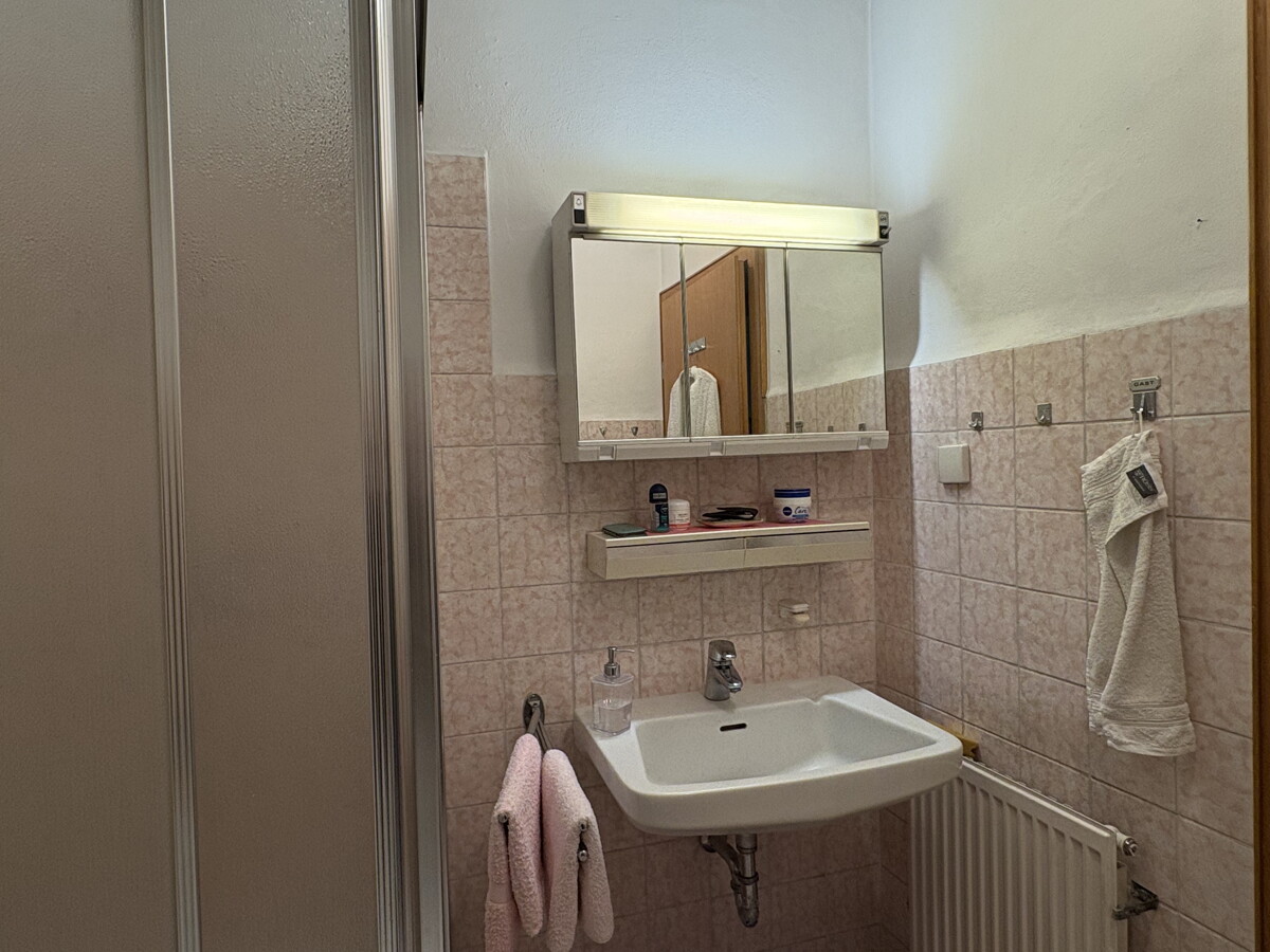 Badezimmer: mit Wanne, renovierungsbedürftig, aber funktional.