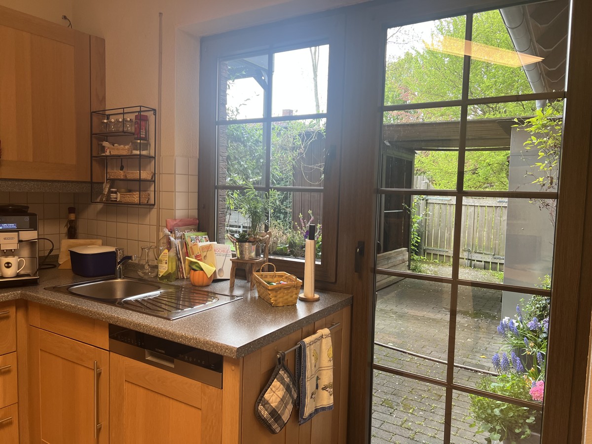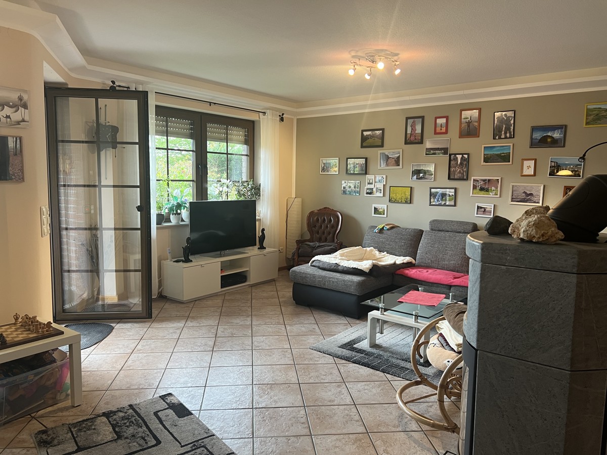 Die Erdgeschosswohnung besticht durch großzügige 110 m² mit direktem Zugang zur Gartenterrasse – ein idealer Ort für gesellige Abende oder ruhige Stunden im Grünen. Große Fensterflächen sorgen für viel Licht und ein angenehmes Wohnklima. Der gemütliche Kamin im Wohnbereich unterstreicht die behagliche Atmosphäre.