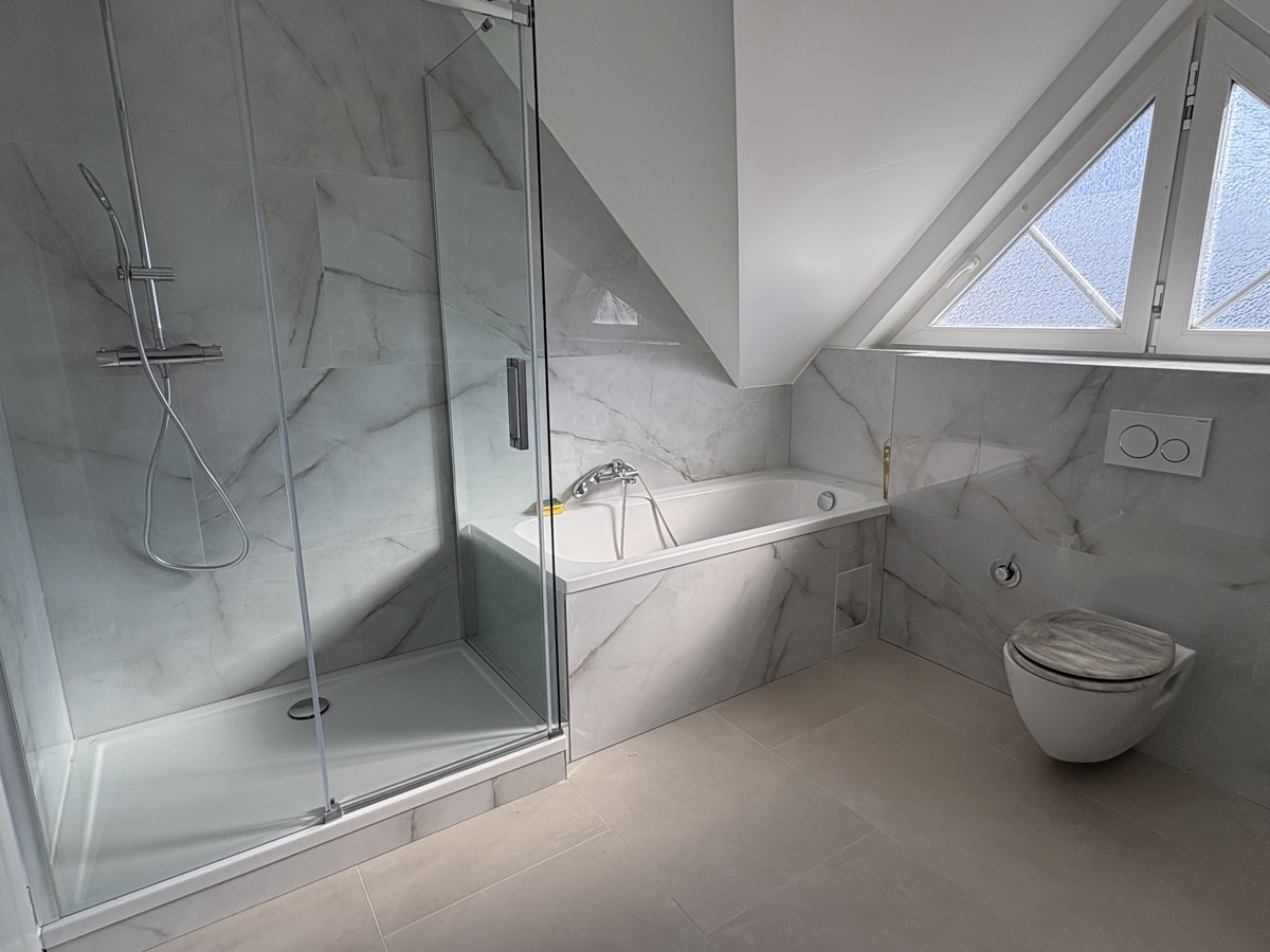 • Badezimmer: Das neu renovierte Badezimmer ist großzügig gestaltet und verfügt über moderne Ausstattung wie eine Dusche und eine Badewanne.