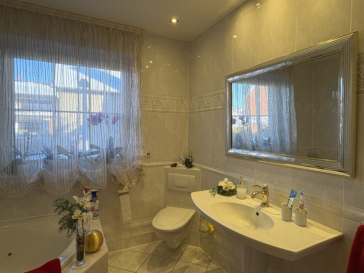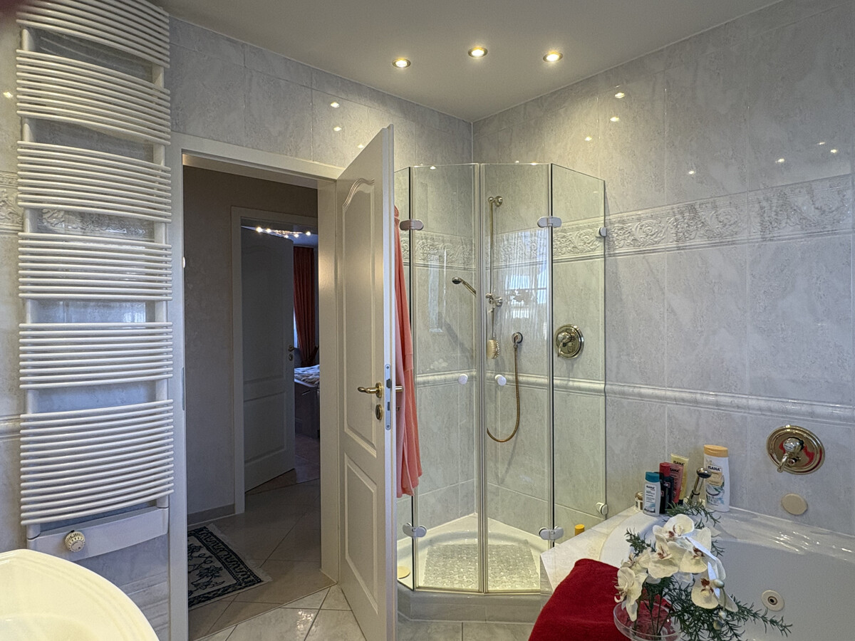 Das Hauptbad verfügt über Dusche, Whirlpool, WC, Bidet und stilvolle Wand- und Bodenfliesen.