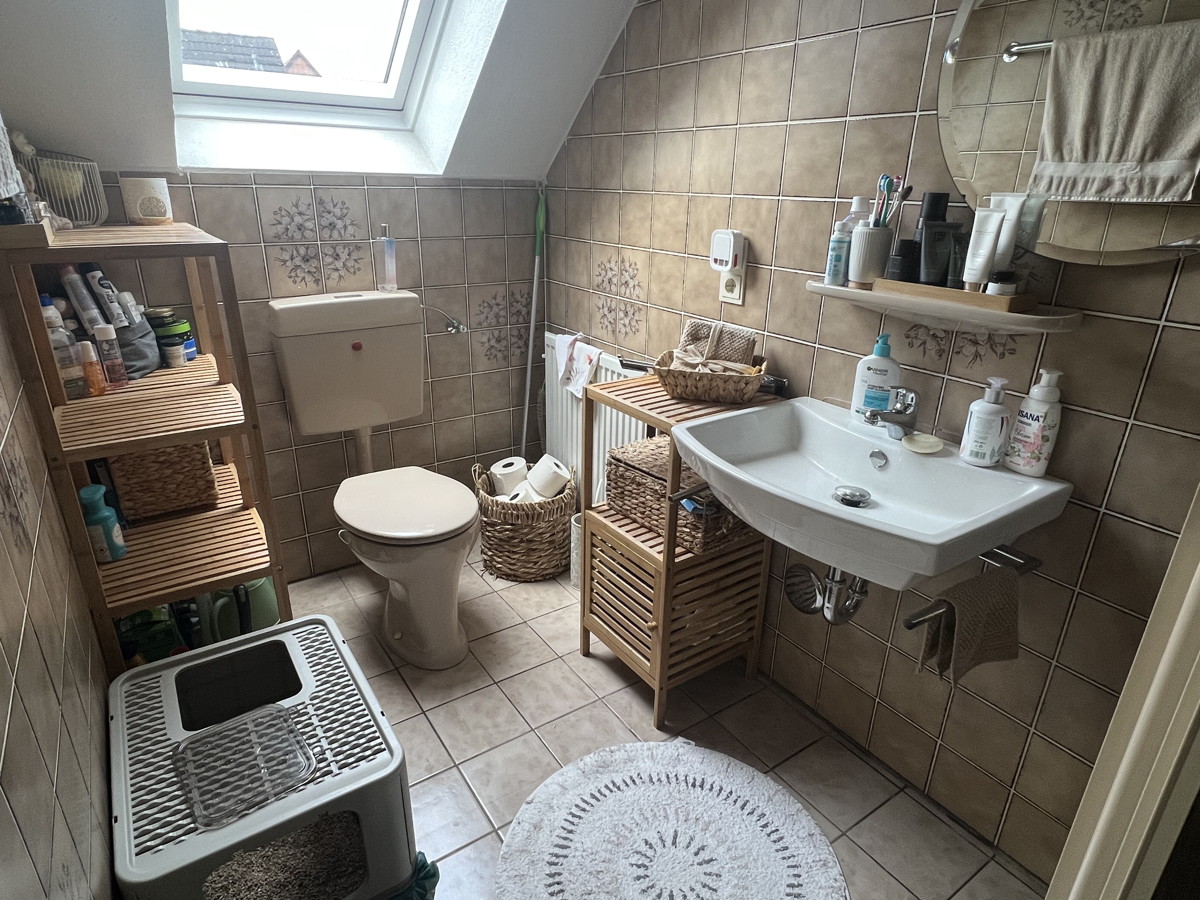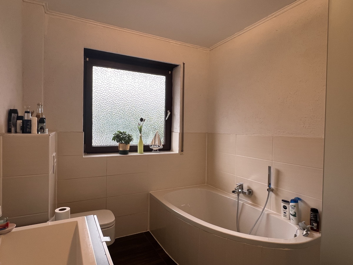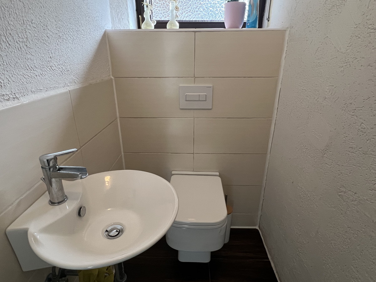 Das elegante Badezimmer ist mit schwarz-grauen Fliesen gestaltet und bietet eine Badewanne, während das separate Gäste-WC in Beige gehalten ist.
