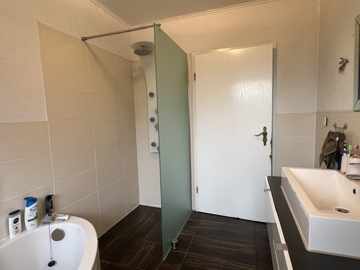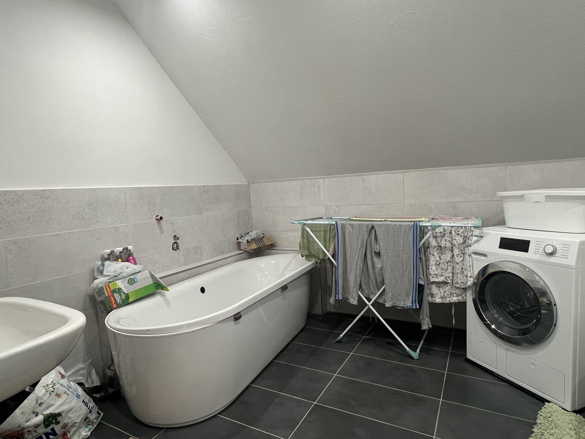 Zwei Schlafzimmer mit hochwertigen Böden, ein stilvolles Badezimmer mit halbhoch beigen Fliesen, einer Rundbadewanne und einer Regendusche sowie ein separates Gäste-WC komplettieren diese Ebene.