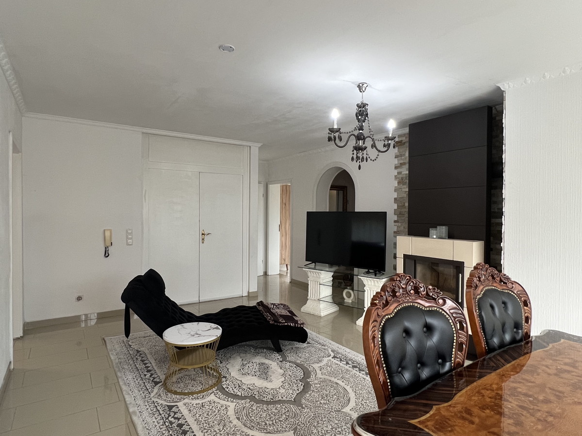 Vom Flur sind alle Räume erreichbar: ein großes Wohnzimmer mit Balkon und Fensterfront, eine Küche mit beigem Fliesenspiegel, ein weiteres Zimmer mit Kamin sowie ein Schlafzimmer mit eigenem Balkon.