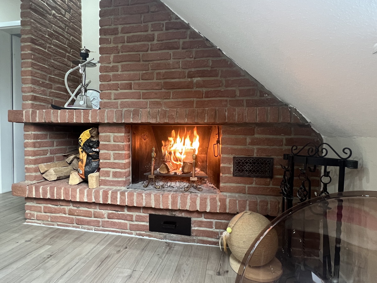 Das Esszimmer verfügt über einen Kamin – ein idealer Ort für gesellige Abende. Von hieraus erreichen Sie eine erhöhte Terrasse, die über eine Steintreppe in den Garten führt, der teilweise gepflastert ist.